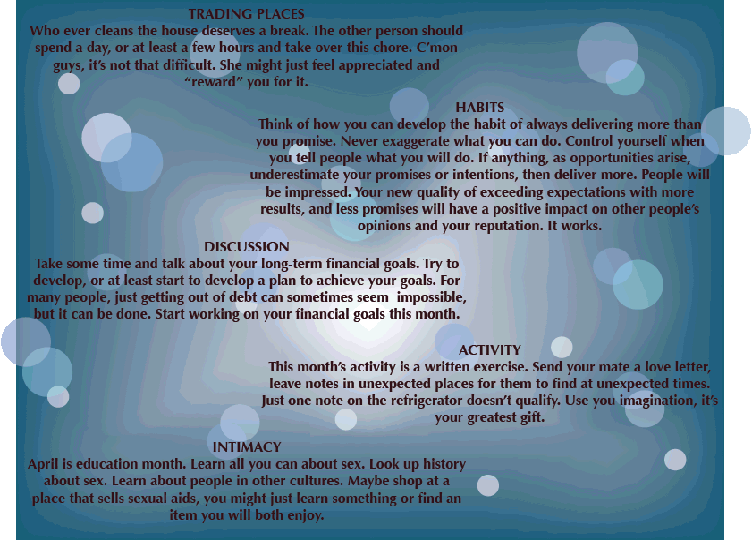 | The purpose of the relationship calendar is to expand your horizons, have fun and expose you to a wider variety of meaningful experiences. An agreement or contract may not be right for most people, but this calendar is. Use it as a marriage calendar. The Intimate Edition suggestions will give you ideas to keep your sex life interesting and more fun. The Religious calendar will help stimulate your spiritual life. Take advantage of these suggestions and make some of your own. Your life will be better; therefore, your relationship will be better. The calendar will inspire you to use your imagination and is a key element of the success of your calendar. |