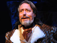 | "Back in the early ‘80s, Robert Smyth directed one of my all-time favorite produtions, Christopher Marlowe’s Dr. Faustus. What grabbed me was his concept of evil. The actor playing Mephistopheles wasn’t in the least demonic or bug-eyed. In fact, he moved slower than everyone else, somewhat like a monk. The actor made it clear that evil can take its time – that evil has all day. What Smyth did with time in Faustus, he does with space in Dun Cow. Evil worms its way everywhere in this beast fable. One sees visible agents, like Cockatrice, hears of basilisks, but the production suggests that what goes unseen is ever-present, onstage and in the audience, and ever ready to strike. Only constant diligence can keep it at bay. As the title character, Kathleen Calvin never says a word but speaks volumes in a balletic sequence. The Dun Cow, a brownish beast with horns, can help humanity. But in Wangerin’s world, free will rules, not destiny. The book is being written as we speak, and humans can’t wait passively for divine intervention. The Dun Cow helps those who help themselves." | |