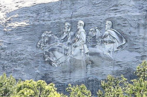巨大花崗岩の岩肌に浮き彫りにされた、南軍大統領と将軍達の乗馬像。