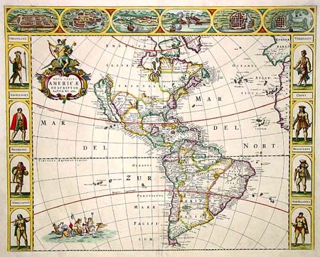 (ブローの)西図によれば地理学的形状は勢いよく変化に富む。この図では東部と南部が明確なだけである。北部はグリーンランドにつながるように描かれている。西部については、北緯28度以北、あるいは其未蝋(キビラ、Quivira)と呼ばれる地は、その極まる所は不明であると記述している。この北緯28度線はバハ・カリフォルニア半島の中間地点を通るが、新スペインでさえも領土拡張の意図を持って北緯32度43分にあるサンディエゴに進出したのがやっと1769年のことだ。この当時、北アメリカ大陸の中部から北部の西海岸は全く未知の大陸だった(右図:1660年デ・ウィット地図参照。現在のバハ・カリフォルニア半島までしか記載されていない。それも半島でなく、独立した島として描かれている)。