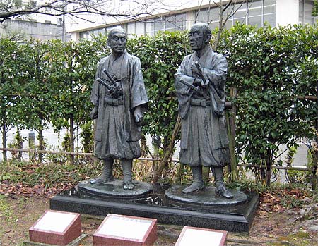 横井小楠(右)と由利公正の銅像。安政5(1858)年に同道し、