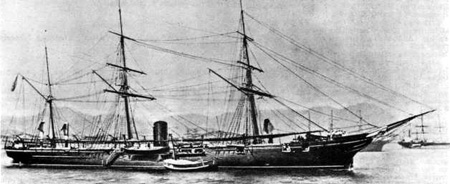 しからば繋泊せる米艦に依頼せんと思いたれど、あまりに卒爾(そつじ)なれば、まず仏国公使に紹介せしむるこそよけれとて、使(山口駿河守なりしと覚ゆれど確かならず)をロセスの許に遣わしたるに、ロセスは快く承諾して紹介状を与えたり。一行はそを携えて米艦に赴きたるに、米艦にては仏国公使の紹介ありしためにや極めて優遇し、酒肴を出してもてなしけるが、とかくする中開陽丸帰港したるをもて、更に同艦に転乗したり。