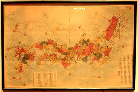 この捕鯨博物館所蔵の地図について最近(2021年)読者の群馬県在住のS氏からご指摘を受け、『鎖国時代、海を渡った日本図、大阪大学出版会』を確認し、捕鯨博物館所蔵版のイメージと比較たところ、一部を除き虫食いや汚れ、摩耗があまり見えずほゞ良好な状態から見て、長久保赤水作製による「改正日本輿地路程全図」の天保11(1841)年改訂版かそれに近い物の様である。寛政3(1791)年改訂版は最下段左隅に発行時期と鐫字者及び発行者の名前を入れた囲みがあるが、この捕鯨博物館所蔵の地図には最下段左隅の囲みが見えない。然しこの捕鯨博物館所蔵の地図は、長久保赤水製作の日本輿地路程全図の系列である事はほぼ確実に見える。伊能忠敬の「大日本沿海輿地全図」の一般利用が始まったのは、明治になってからであると言う(『海を渡った日本図』)。当時伊能図以外の、この様にかなり正確な、しかも緯線も経線も入った地図がコンパスと共に日本の船乗りの間で使われていた事は驚きである。京都中心の京都御所紫宸殿の位置は北緯35度1分27秒、東経135度45分44秒であるが、この捕鯨博物館所蔵の地図の北緯35度の緯線はほぼその辺りを通り、度数が入っていない経線も京都を通っている。当時は勿論「本初子午線」の国際規定などは無く、京都の三条改暦所(北緯35度0分35秒、東経135度44分14秒近辺)を通る子午線を経度の基準(=0度)としたと言う。