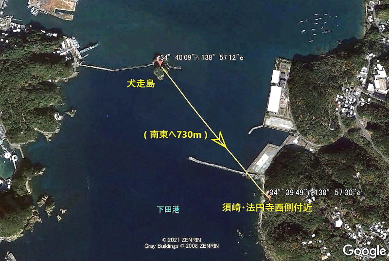 下田港内・犬走島位置。当時の位置観測情報と現在位置情報。