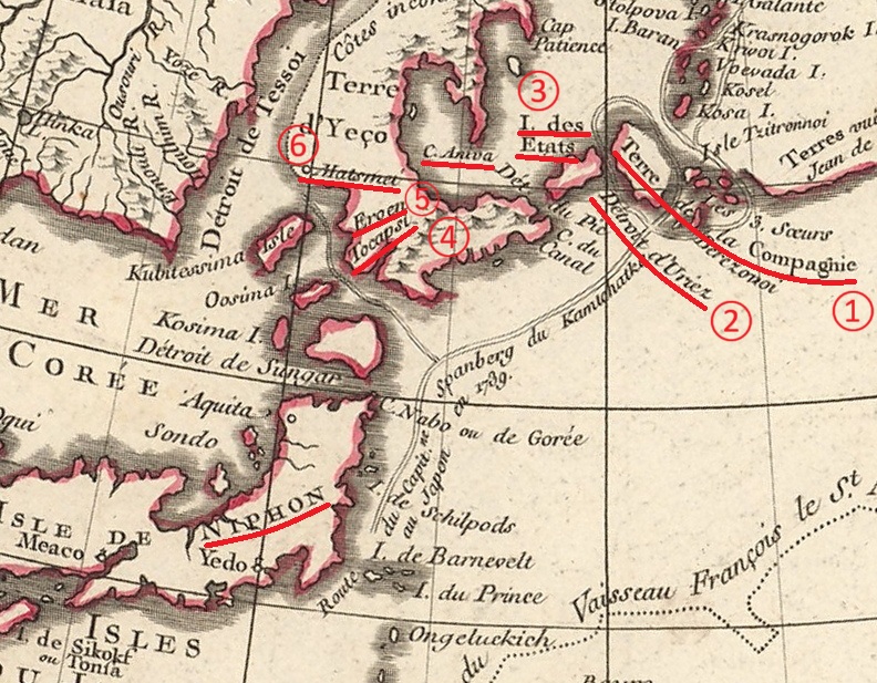 〔ユリース〕」にしたため、以降の各国の地図には「Detroit du Uriez、Uries海峡、Uries Strait」のようになってしまい、後の1787(天明7)年7月にこの地を探検したフランスのラ・ぺローズ探検隊もこの地図を使ったと言う