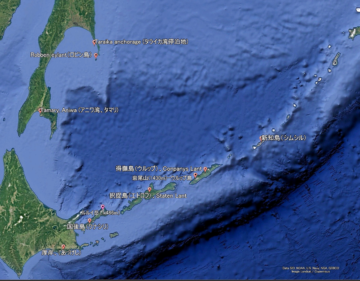 停船した場所はフリース海峡と名付けたエトロフ島とウルップ島間の海峡を南から北に抜けた、ウルップ島のオホーツク海側の岸の近くである。激しい水音は雪解け水が濁流となり崖から海に落ち込む音だった。これは全くの幸運で、夜間に2島間の海峡に入り込み、夜明けに錨を入れて停船した場所は少しオホーツク海側に抜けた地点で、座礁することなくエトロフ島とウルップ島を発見したのだ。一等航海士・クーンはこの停船地を「北緯46度6分」と測定し記録しているが、「停船地は南南東に高い山が見え・・・岸から5qもない程の近場」と言う記述から、「高い山」を「岩尾山」として「Google Earth」で推定すると実際には「45度49分」ほどに見えるから、たかだか「17分」ほどの測定誤差しかない。すなわち南北へほぼ31q ほどのズレしかない事になる。六分儀が発明される百年以上も前で測定器具は不明ながら、予想以上の驚くべき測定精度である。当然ながら緯度の測定原理は昔から知られていたのだが、それなりの努力と工夫があったはずである。クーンは同時に経度も記録しているが、その測定方法や基準点は全く不明であり、ここでは採用しない。