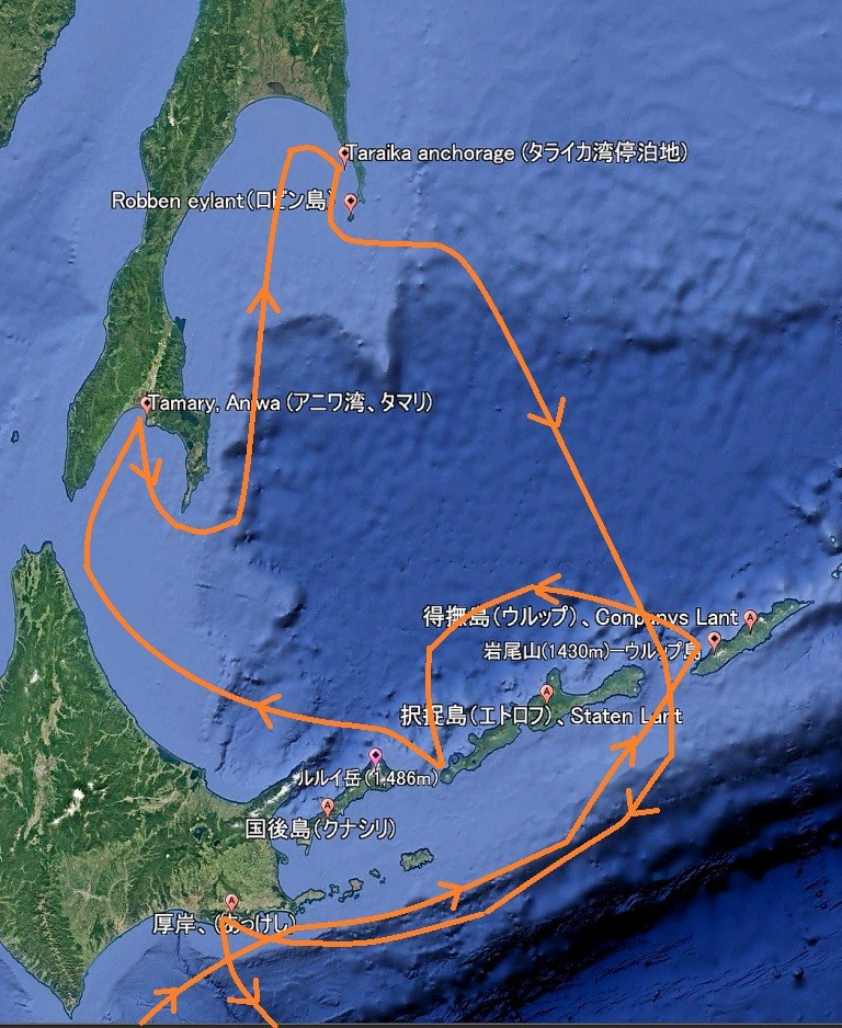 霧も晴れた7月19日の朝停泊地を出発し、人家もかなり見える沖を通り、20日霧も晴れた午後アニワ岬を東南東に確認して南下し、岬を東にまわった。この時霧も晴れていたから、アニワ岬から100qほど西側のラ・ペルーズ海峡